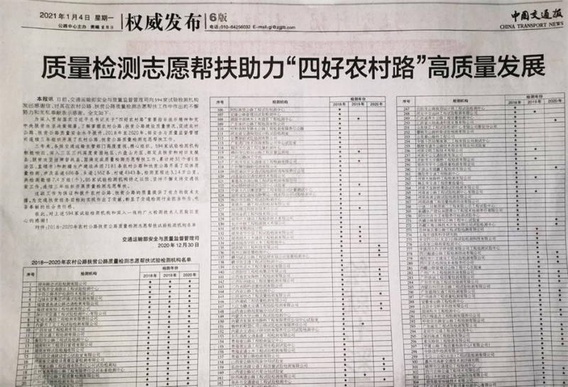 2020年12月30日,佳岳公司收到來(lái)自交通運(yùn)輸部安全與質(zhì)量監(jiān)督管理司的感謝信,并在1月4日中國(guó)交通報(bào)6版以《質(zhì)量檢測(cè)志愿幫扶助力“四好農(nóng)村路”高質(zhì)量發(fā)展》為題進(jìn)行了專題報(bào)道,對(duì)交建集團(tuán)佳岳檢測(cè)公司在農(nóng)村公路、扶貧公路質(zhì)量檢測(cè)志愿幫扶工作中作出的不懈努力和無(wú)私奉獻(xiàn)表示感謝。