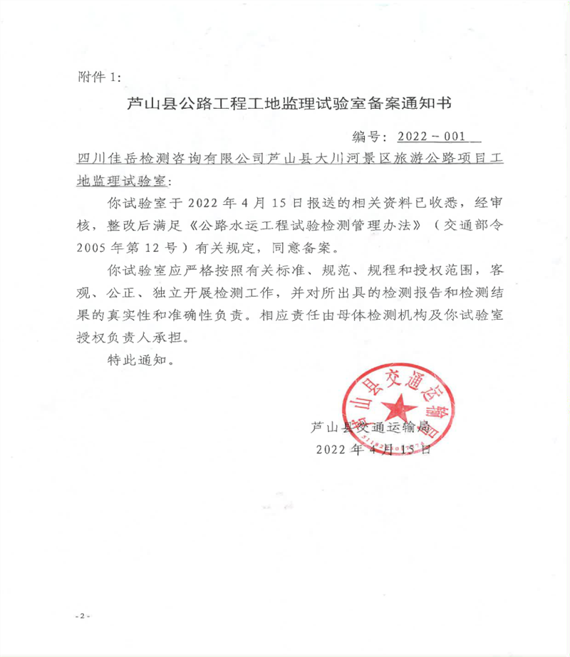 近日,交建集團(tuán)四川佳岳檢測咨詢有限公司蘆山縣大川河景區(qū)旅游公路項(xiàng)目監(jiān)理試驗(yàn)室,通過蘆山縣交通運(yùn)輸局備案驗(yàn)收,標(biāo)志著佳岳公司蘆山監(jiān)理試驗(yàn)室對(duì)蘆山縣大川河景區(qū)旅游公路項(xiàng)目可以獨(dú)立開展母體授權(quán)參數(shù)內(nèi)的檢測工作,出具相應(yīng)的檢測報(bào)告。