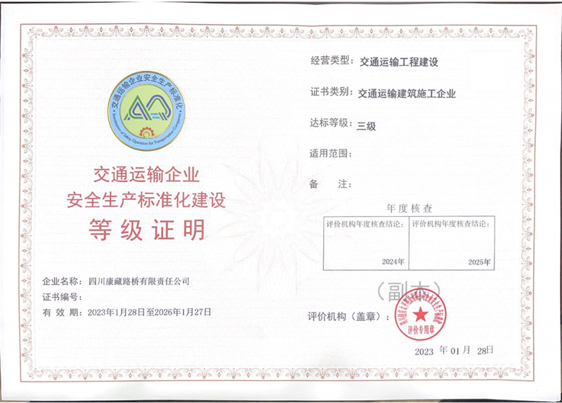 近日,經(jīng)四川省交通運(yùn)輸企業(yè)安全生產(chǎn)標(biāo)準(zhǔn)化評(píng)價(jià)機(jī)構(gòu)綜合評(píng)定,雅安交建集團(tuán)四川康藏路橋有限責(zé)任公司順利通過(guò)安全標(biāo)準(zhǔn)化三級(jí)評(píng)價(jià)驗(yàn)收并獲得“安全生產(chǎn)標(biāo)準(zhǔn)化三級(jí)企業(yè)”等級(jí)證明證書。