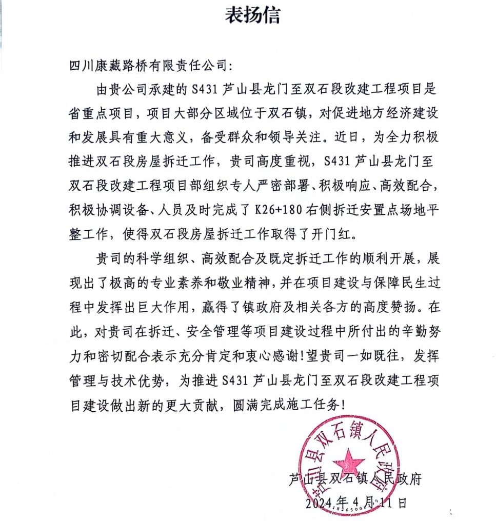 近日,雅安交建集團(tuán)四川康藏路橋有限責(zé)任公司收到來自蘆山縣雙石鎮(zhèn)人民政府的表揚信。信中對S431蘆山縣龍門至雙石段改建工程項目部積極協(xié)調(diào)設(shè)備、人員配合當(dāng)?shù)卣瓿蒏26+180右側(cè)拆遷安置點場地平整工作,使得雙石段房屋拆遷工作取得了開門紅給予了高度評價和贊揚。