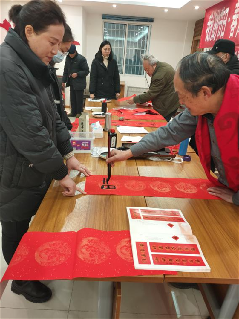 活動(dòng)現(xiàn)場,翰墨飄香,春意融融,呈現(xiàn)出一派吉祥喜慶的新春景象。書法家們揮毫潑墨,運(yùn)筆如飛,為居民寫春聯(lián)、送福字,一幅幅寓意吉祥的春聯(lián)相繼出爐,一幅幅充滿了吉祥祝福和濃濃年味的手寫春聯(lián)送到居民手中,為即將來臨的春節(jié)增添了濃濃的喜慶氛圍。居民們拿著紅紅的春聯(lián),臉上洋溢著幸福的笑容,整個(gè)現(xiàn)場被紅色的春聯(lián)和熱鬧的人群烘托得年味十足。吹響新春“集結(jié)號”,服務(wù)群眾“零距離”。