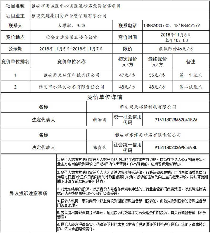雅安交建集團資產(chǎn)經(jīng)營管理有限公司關(guān)于雅安市雨城區(qū)中心城區(qū)連砂石競價銷售結(jié)果公示