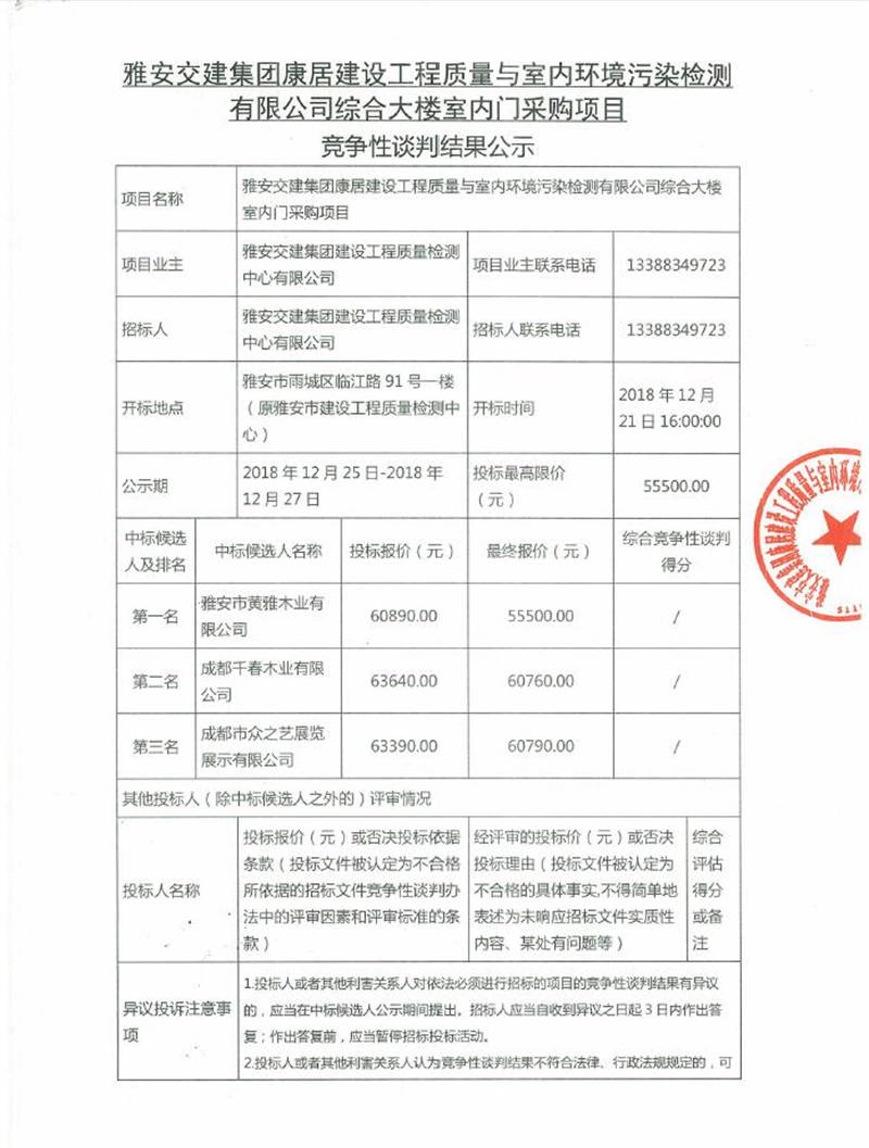 綜合大樓室內(nèi)門采購項(xiàng)目競爭性談判結(jié)果公示