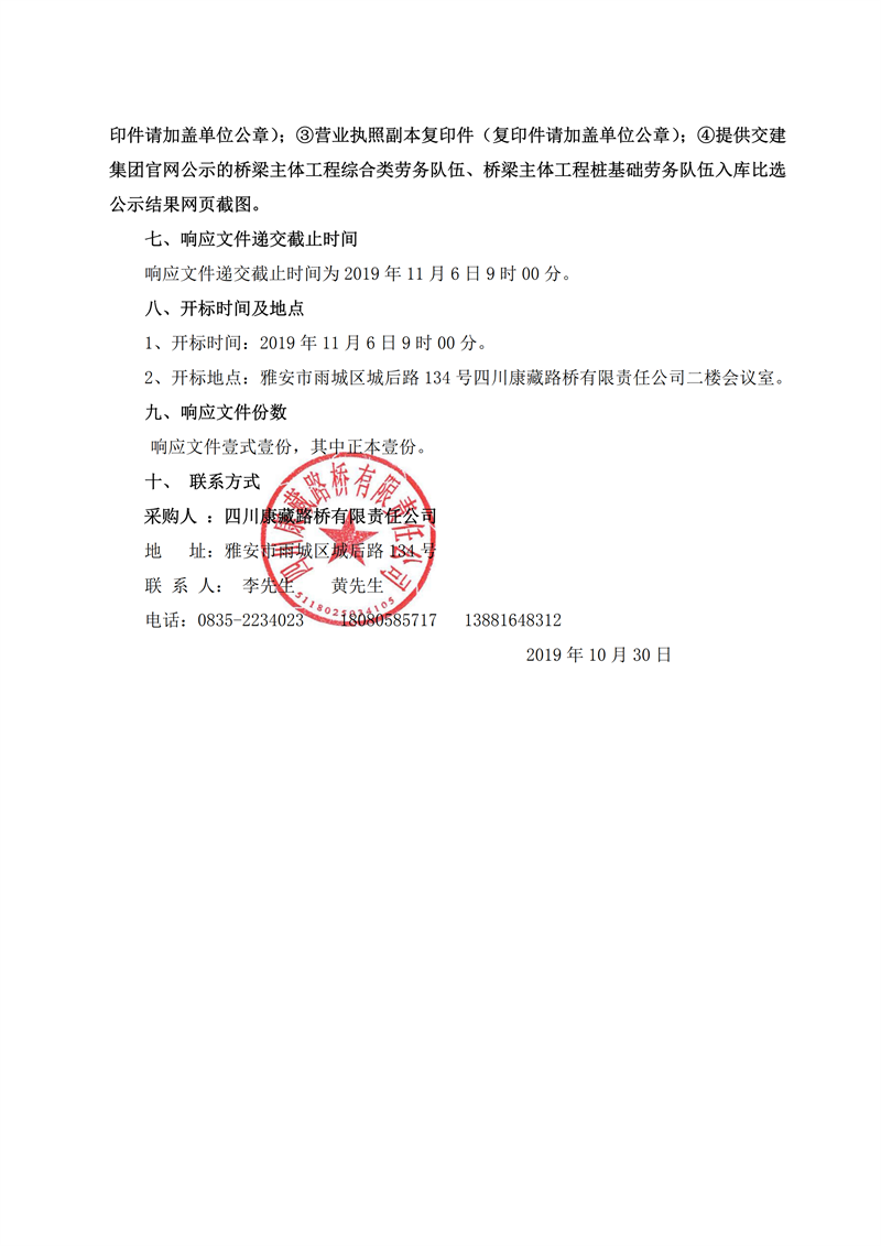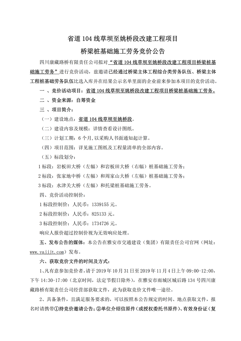 四川康藏路橋有限責任公司省道104線草壩至姚橋段改建工程項目橋梁樁基礎施工勞務競價公告