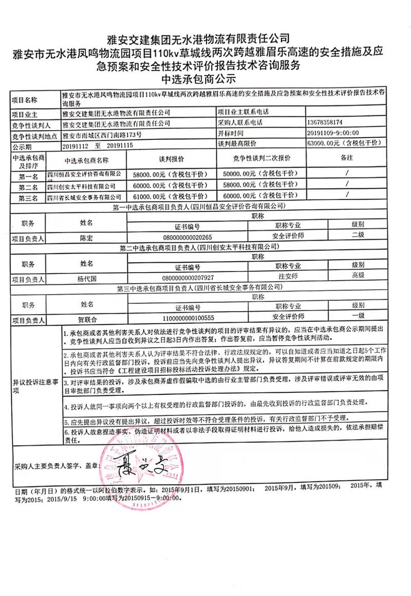 雅安交建集團(tuán)無(wú)水港物流有限責(zé)任公司雅安市無(wú)水港鳳鳴物流園項(xiàng)目110kv草城線(xiàn)兩次跨越雅眉樂(lè)高速的安全措施、應(yīng)急預(yù)案以及安全性技術(shù)評(píng)價(jià)報(bào)告技術(shù)咨詢(xún)服務(wù)中選承包商公示