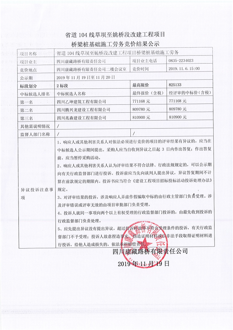 四川康藏路橋有限責任公司省道104線草壩至姚橋段改建工程項目橋梁樁基礎(chǔ)施工勞務(wù)競價(2標段)結(jié)果公示