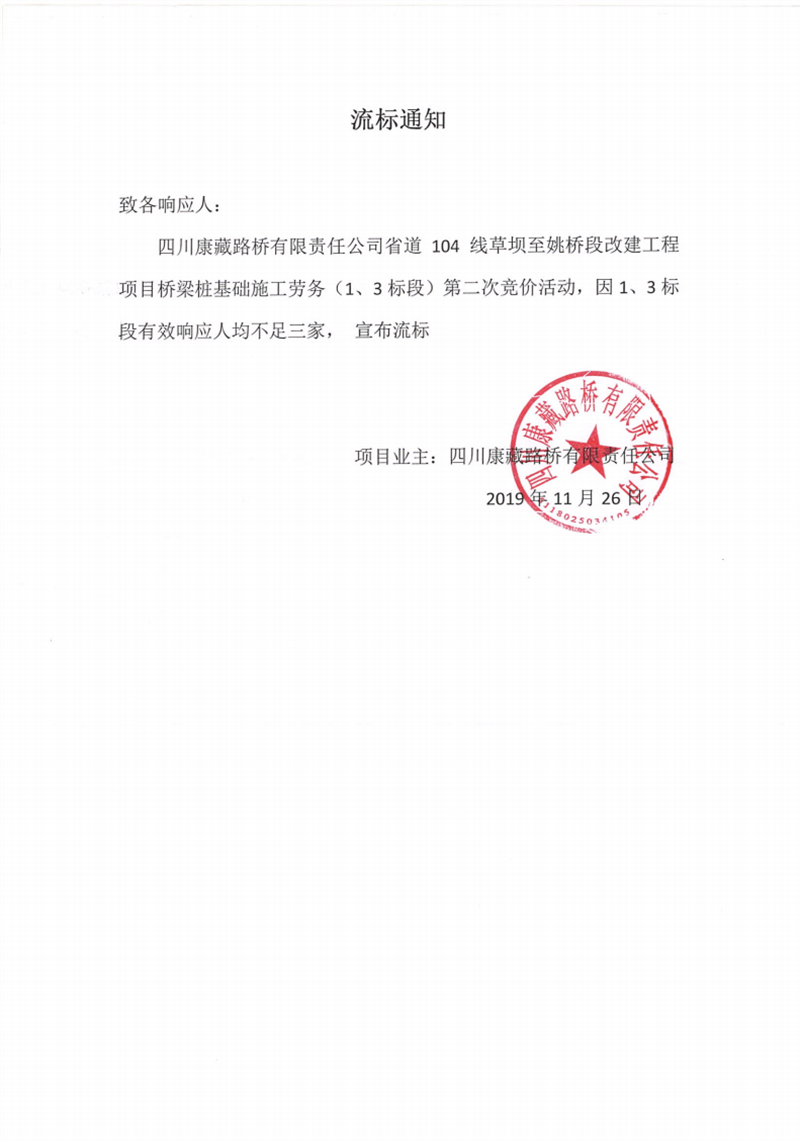 四川康藏路橋有限責(zé)任公司省道104線草壩至姚橋段改建工程項目橋梁樁基礎(chǔ)(1、3標段)施工勞務(wù)競價(第二次)流標通知
