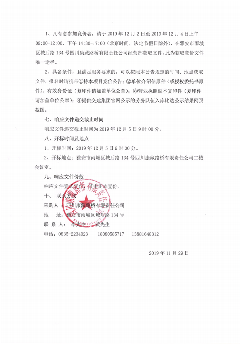 四川康藏路橋有限責(zé)任公司蘆山縣龍門、大川等8個(gè)鄉(xiāng)鎮(zhèn)基礎(chǔ)設(shè)施恢復(fù)提升工程項(xiàng)目施工勞務(wù)(2標(biāo)段)第二次競(jìng)價(jià)公告