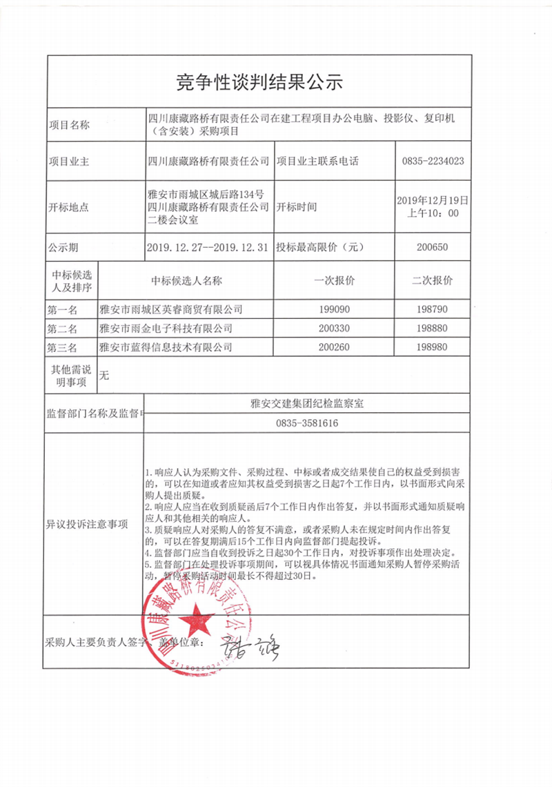 四川康藏路橋有限責(zé)任公司在建工程項目辦公電腦、投影儀、復(fù)印機(jī)(含安裝)采購項目競爭性談判結(jié)果公示