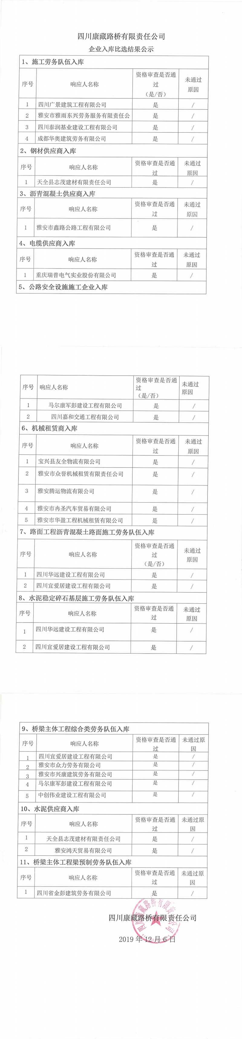 四川康藏路橋有限責(zé)任公司企業(yè)入庫比選結(jié)果公示