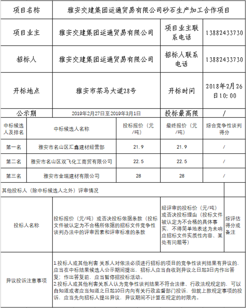 雅安交建集團(tuán)運(yùn)通貿(mào)易有限公司砂石生產(chǎn)加工合作項(xiàng)目競爭性談判結(jié)果公示