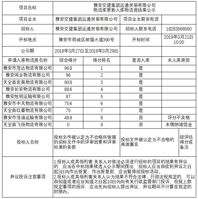 雅安交建集團運通貿(mào)易有限公司物流庫更新入庫物流商結(jié)果公示