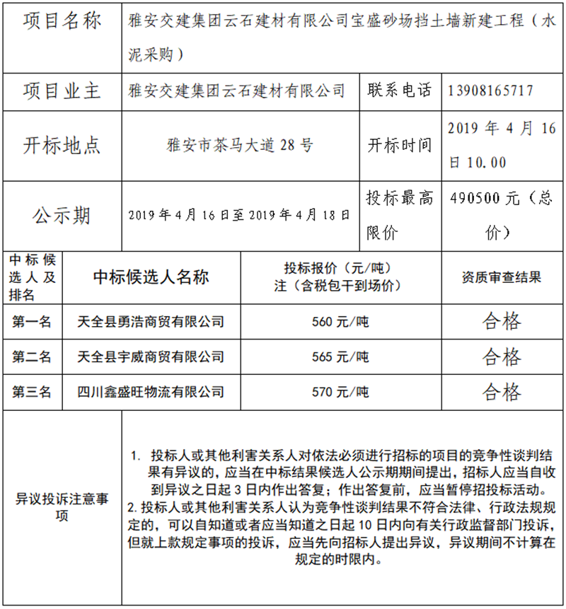 寶盛砂場(chǎng)擋土墻新建工程(水泥采購)項(xiàng)目競(jìng)爭性談判結(jié)果公示