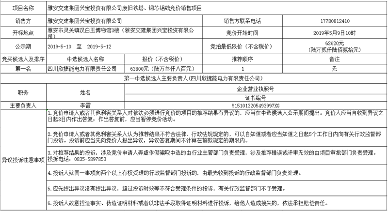 雅安交建集團(tuán)興寶投資有限公司廢舊鐵塔、銅芯鋁線競(jìng)價(jià)銷售項(xiàng)目公示
