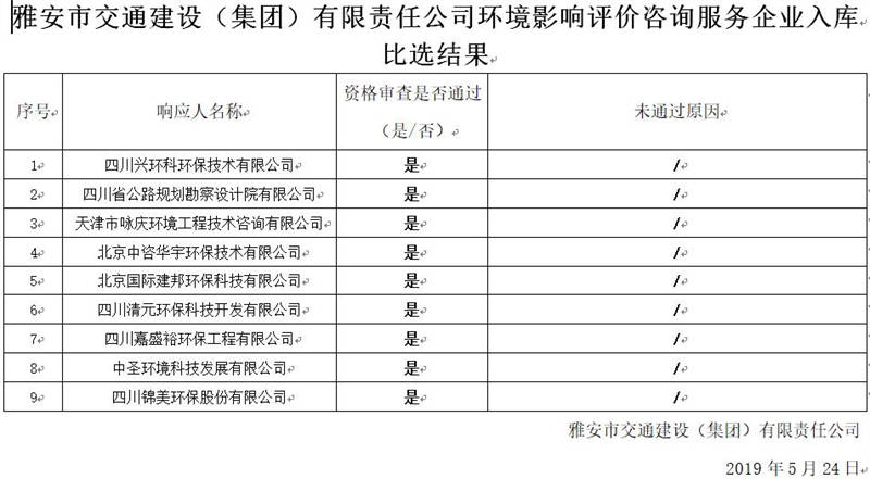 雅安市交通建設(shè)(集團)有限責(zé)任公司環(huán)境影響評價咨詢服務(wù)企業(yè)入庫比選結(jié)果公示
