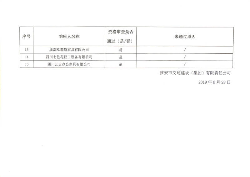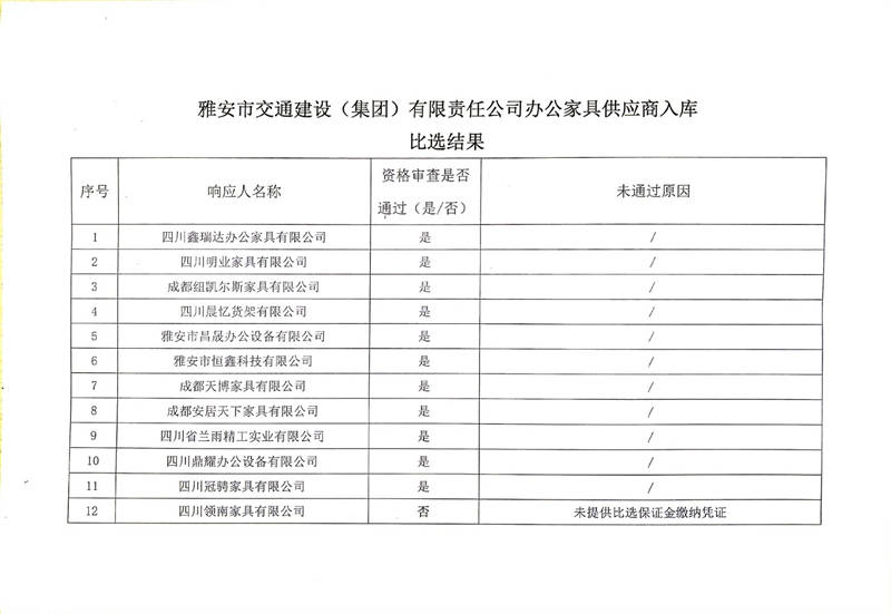 雅安市交通建設(集團)有限責任公司辦公家具供應商入庫比選結(jié)果