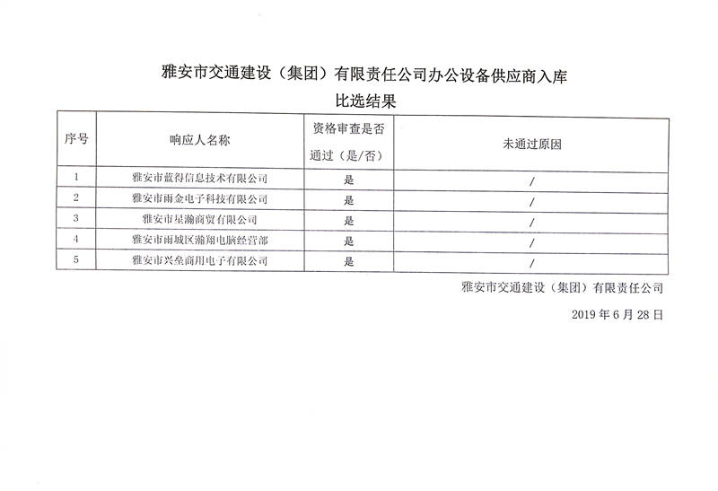 雅安市交通建設(shè)(集團(tuán))有限責(zé)任公司辦公設(shè)備供應(yīng)商入庫比選結(jié)果