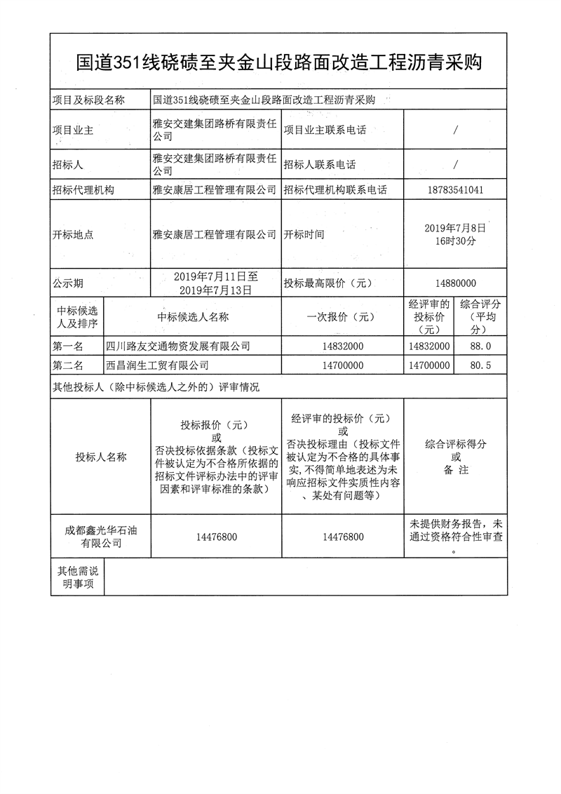 雅安交建集團(tuán)路橋有限責(zé)任公司國道351線磽磧至夾金山段路面改造工程瀝青采購公開招標(biāo)結(jié)果公示