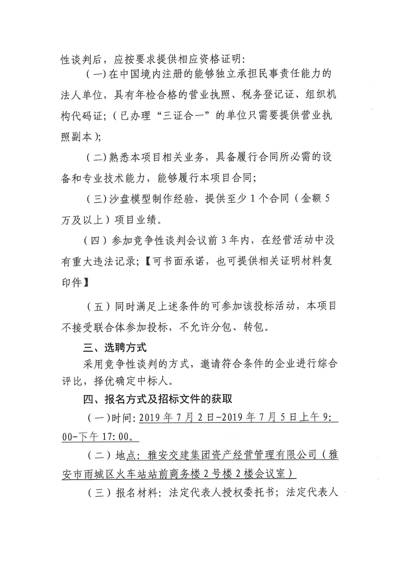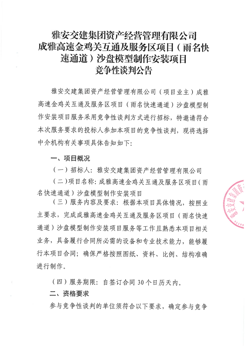 雅安交建集團(tuán)資產(chǎn)經(jīng)營管理有限公司成雅高速金雞關(guān)互通及服務(wù)區(qū)項(xiàng)目(雨名快速通道)沙盤模型制作安裝項(xiàng)目競爭性談判公告