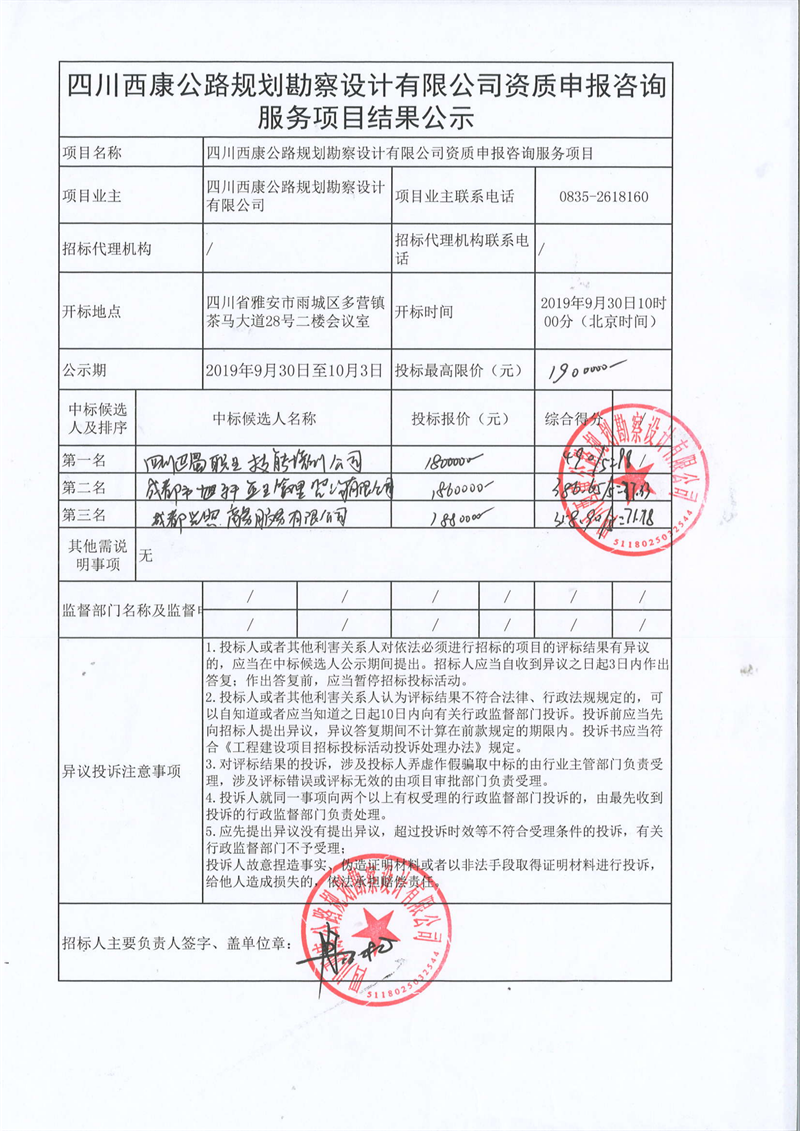 四川西康公路規(guī)劃勘察設(shè)計(jì)有限公司資質(zhì)申報(bào)咨詢服務(wù)項(xiàng)目結(jié)果公示