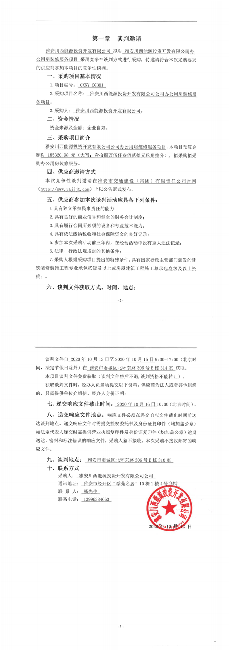 雅安川西能源投資開(kāi)發(fā)有限公司辦公用房裝修服務(wù)項(xiàng)目競(jìng)爭(zhēng)性談判公告