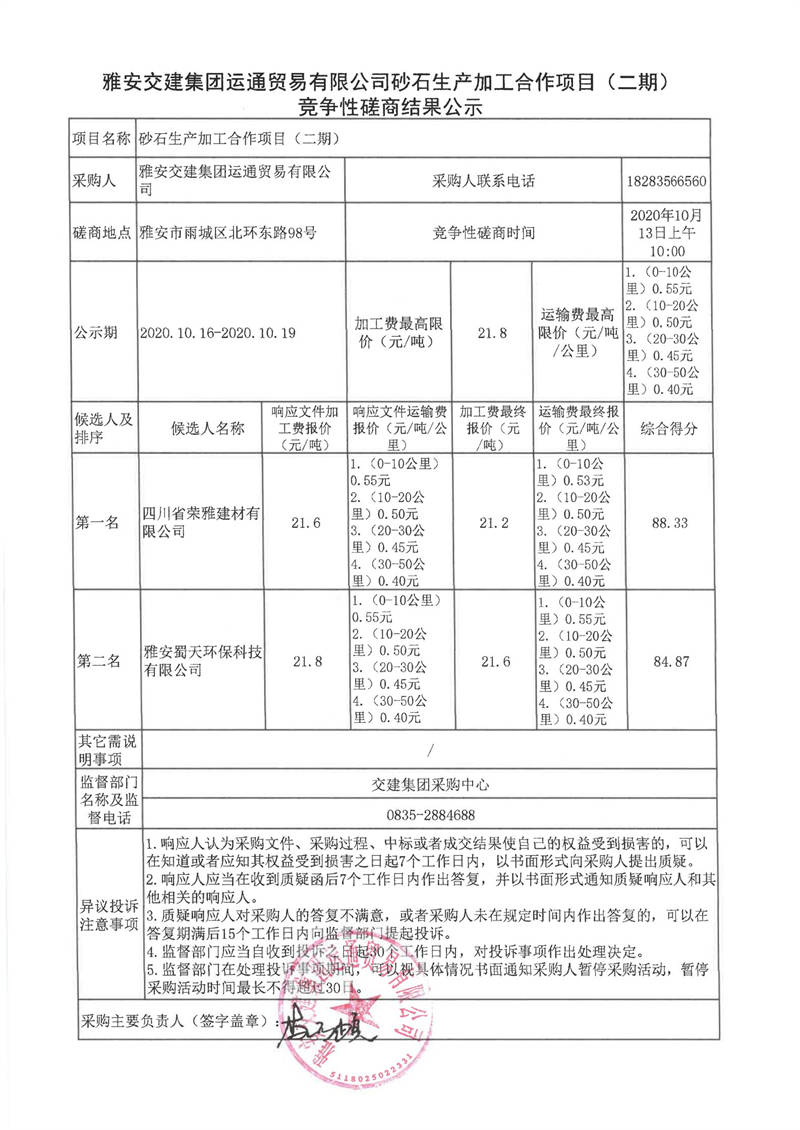 雅安交建集團(tuán)運(yùn)通貿(mào)易有限公司砂石生產(chǎn)加工合作項目(二期)競爭性磋商結(jié)果公示