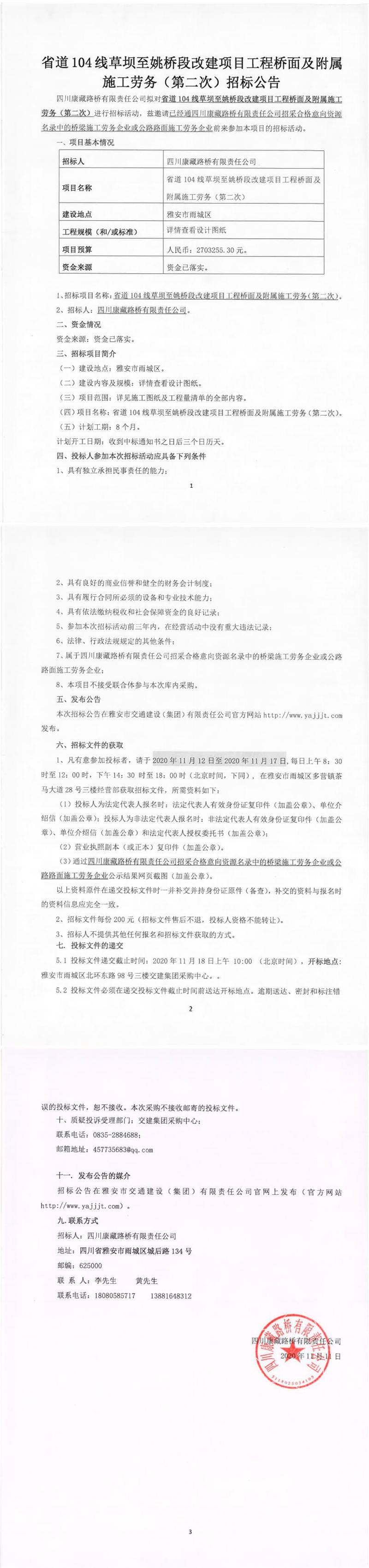 四川康藏路橋有限責任公司省道104線草壩至姚橋段改建項目工程橋面及附屬施工勞務(第二次)招標公告