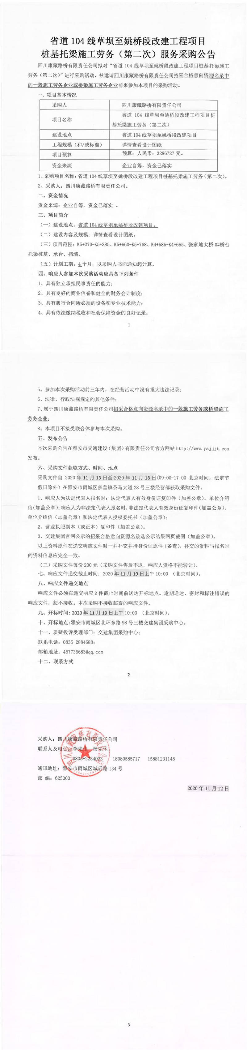 四川康藏路橋有限責(zé)任公司省道104線草壩至姚橋段改建工程項目樁基托梁施工勞務(wù)(第二次)服務(wù)采購公告