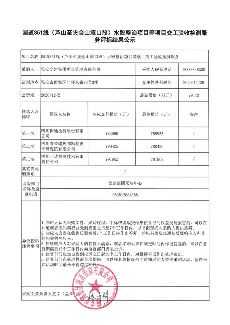 雅安交建集團項目管理有限公司國道351線(蘆山至夾金山埡口段)水毀整治項目等項目交工驗收檢測服務評標結(jié)果公示