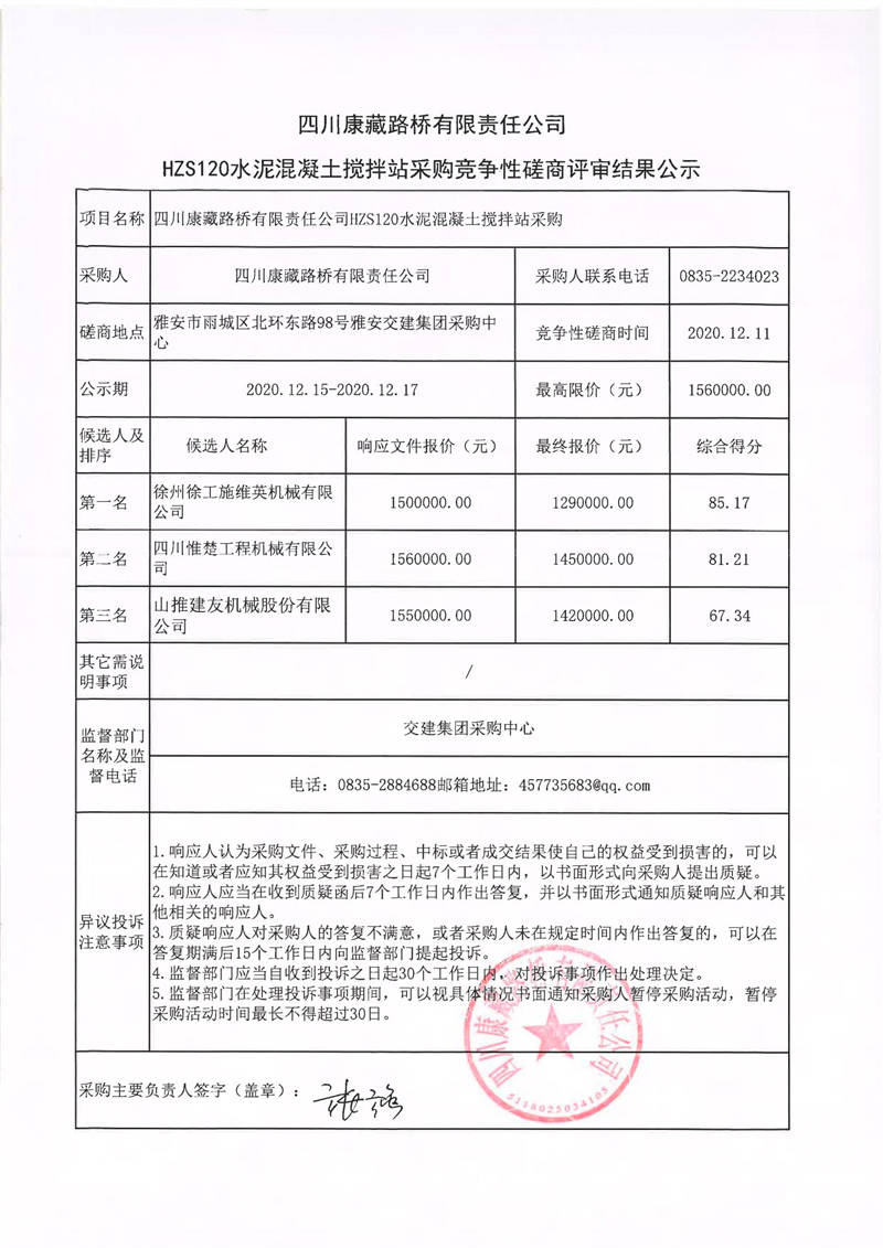 四川康藏路橋有限責任公司HZS120水泥混凝土攪拌站采購競爭性磋商結果公示