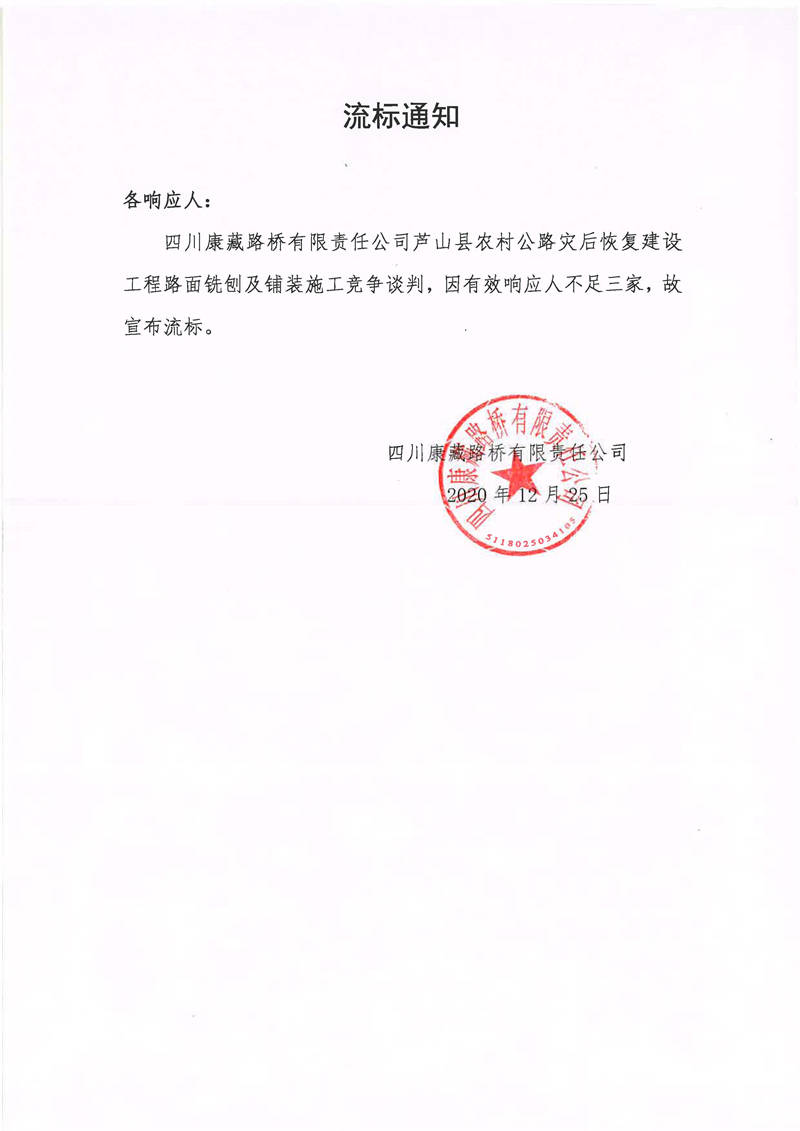 四川康藏路橋有限責(zé)任公司蘆山縣農(nóng)村公路災(zāi)后恢復(fù)建設(shè)工程路面銑刨及鋪裝施工流標(biāo)通知