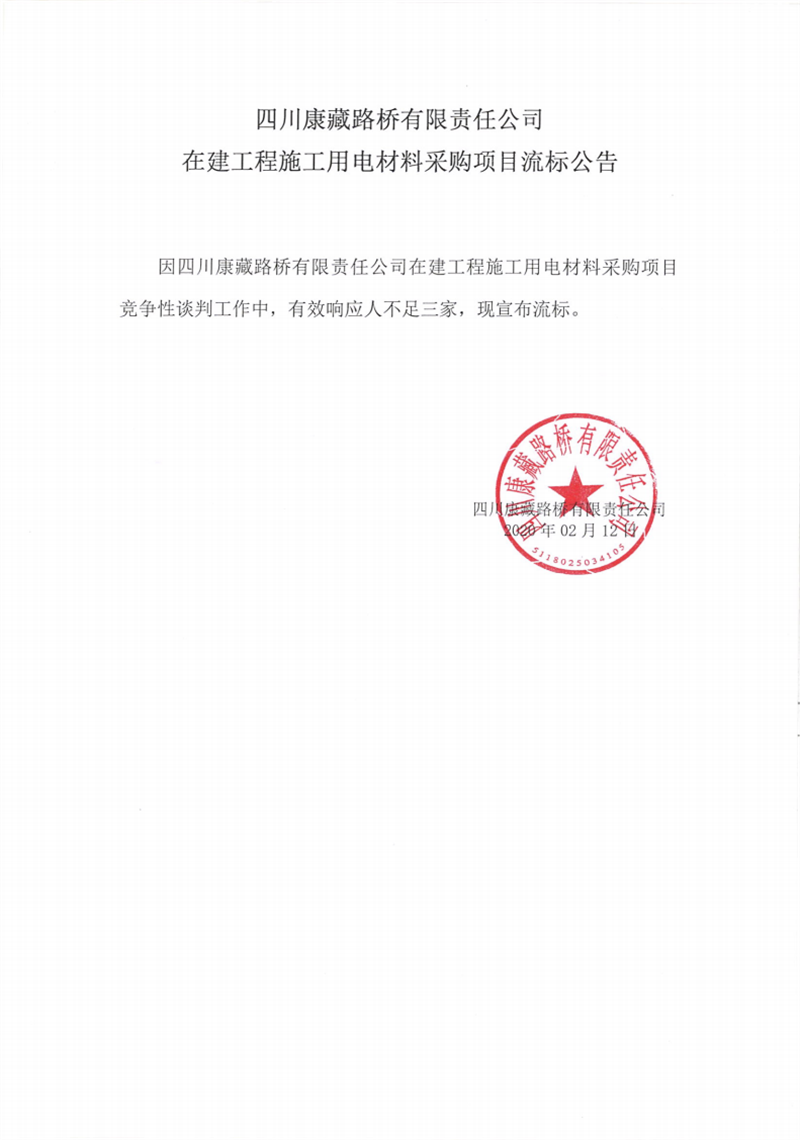 四川康藏路橋有限責(zé)任公司在建工程施工用電材料采購項目流標公告