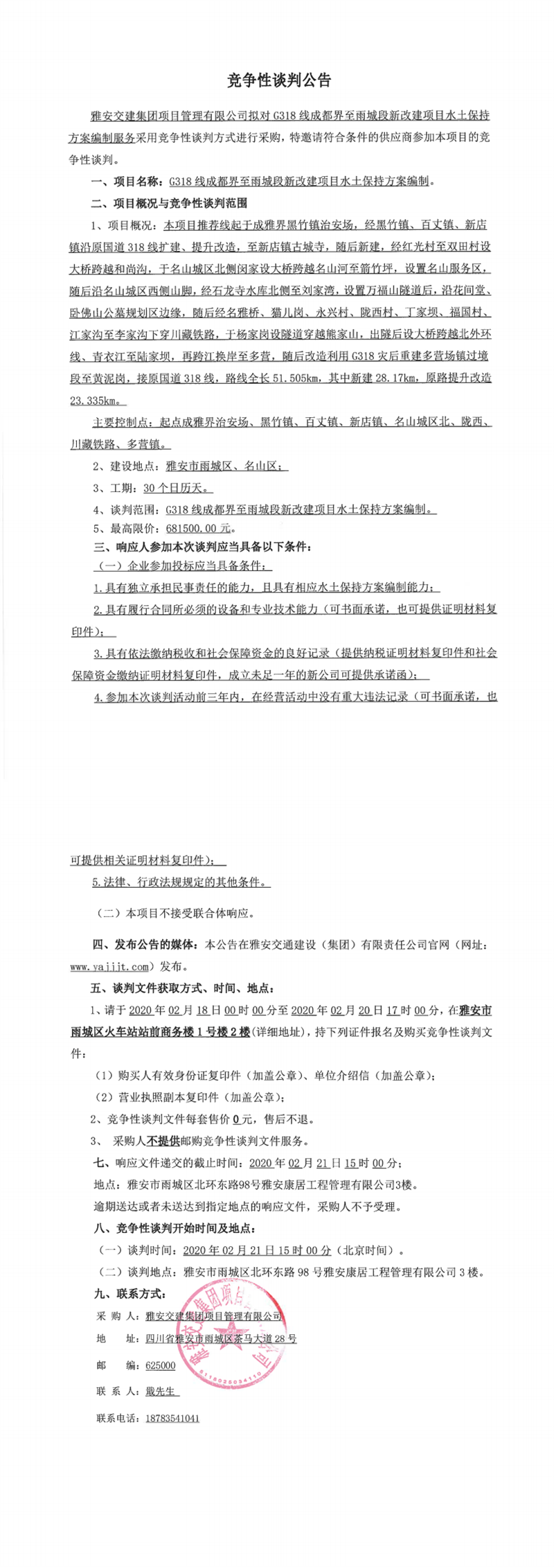 雅安交建集團(tuán)項(xiàng)目管理有限公司G318線成都界至雨城段新改建項(xiàng)目水土保持方案編制競(jìng)爭(zhēng)性談判公告