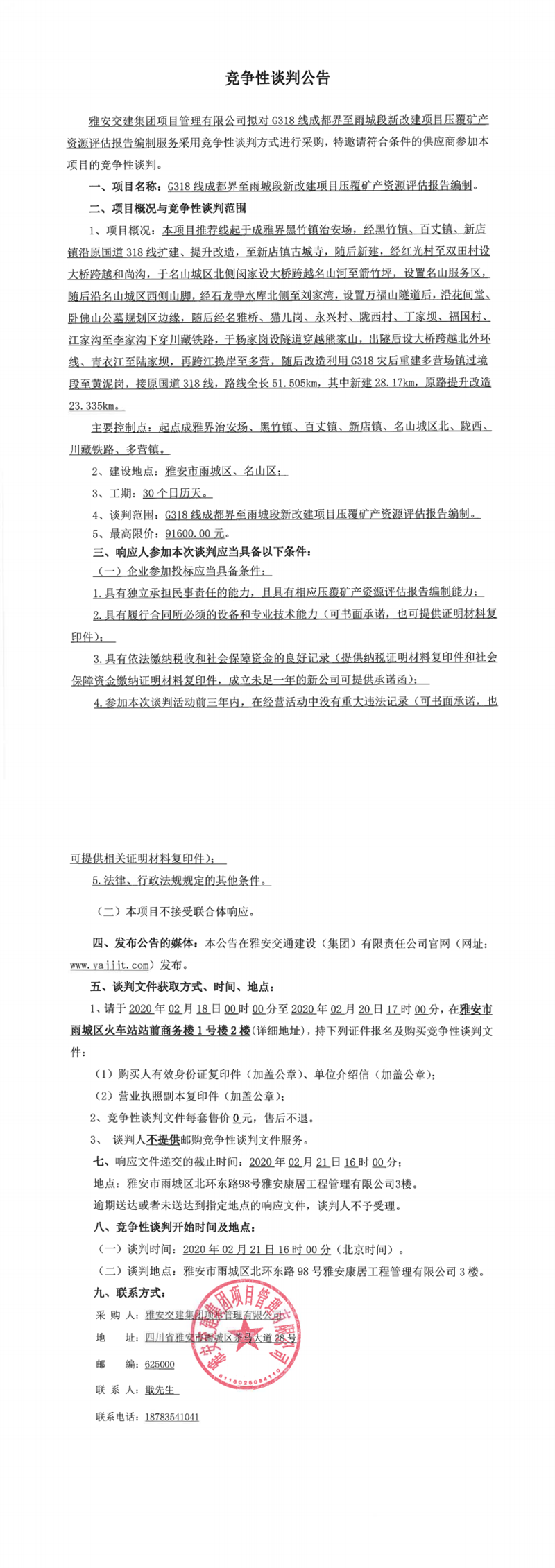 雅安交建集團(tuán)項目管理有限公司G318線成都界至雨城段新改建項目壓覆礦產(chǎn)資源評估報告編制競爭性談判公告