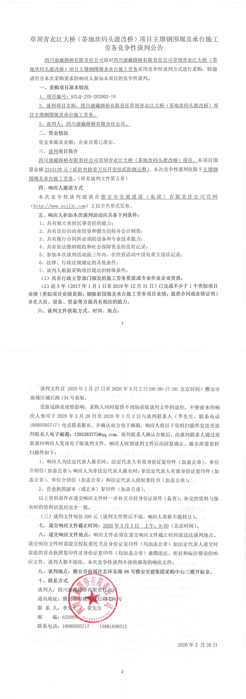 四川康藏路橋有限責(zé)任公司草壩青衣江大橋(茶地坎碼頭渡改橋)項目主墩鋼圍堰及承臺施工勞務(wù)競爭性談判公告