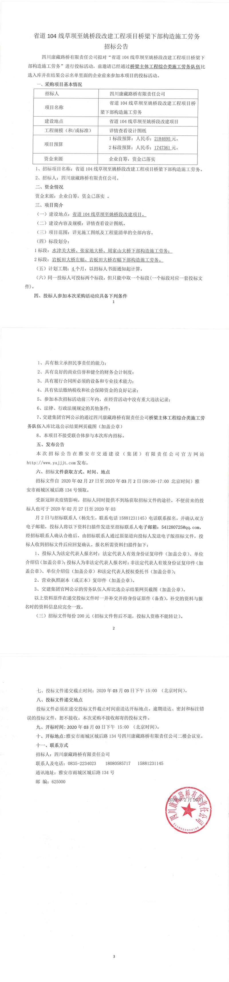 四川康藏路橋有限責(zé)任公司省道104線(xiàn)草壩至姚橋段改建工程項(xiàng)目橋梁下部構(gòu)造施工勞務(wù)招標(biāo)公告