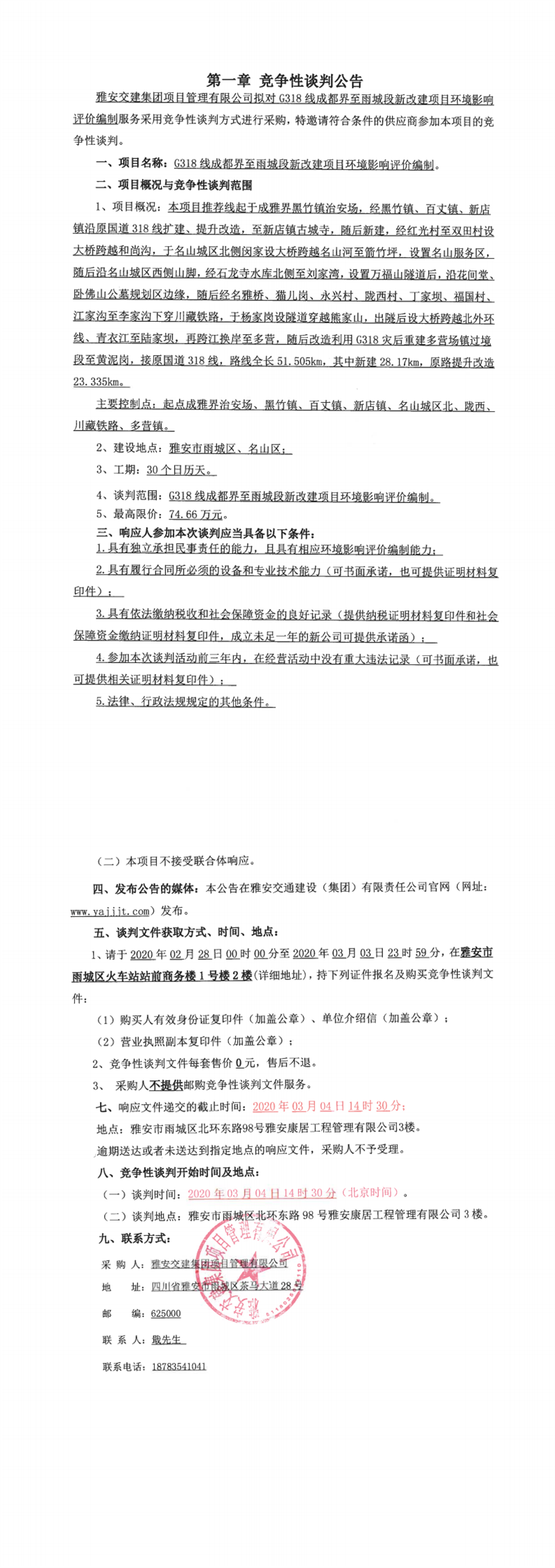 雅安交建集團(tuán)項(xiàng)目管理有限公司G318線(xiàn)成都界至雨城段新改建項(xiàng)目環(huán)境影響評(píng)價(jià)編制競(jìng)爭(zhēng)性談判公告