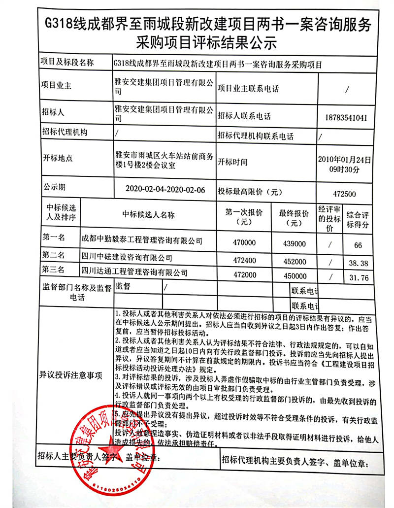 雅安交建集團(tuán)項(xiàng)目管理有限公司G318線成都界至雨城段新改建項(xiàng)目兩書一案咨詢服務(wù)采購項(xiàng)目評標(biāo)結(jié)果公示