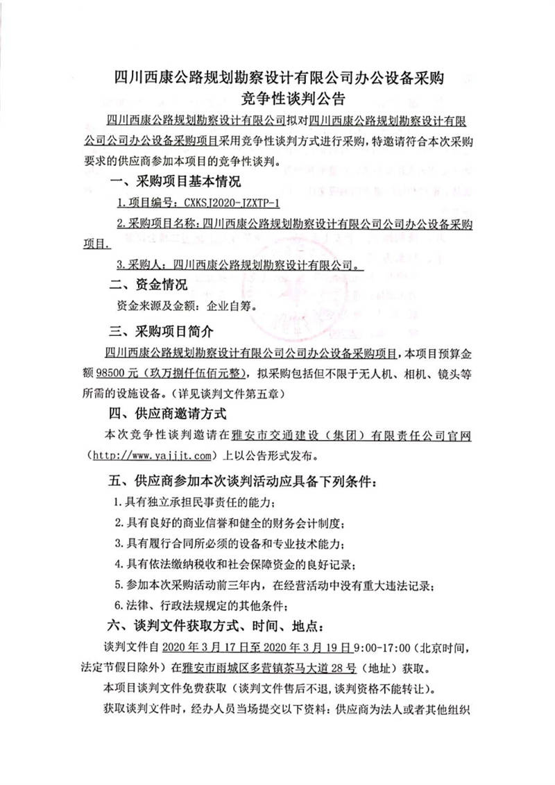 四川西康公路規(guī)劃勘察設計有限公司辦公設備采購競爭性談判公告