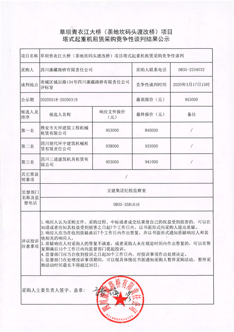四川康藏路橋有限責(zé)任公司草壩青衣江大橋(茶地坎渡改橋)項目塔式起重機(jī)租賃采購競爭性談判結(jié)果公示