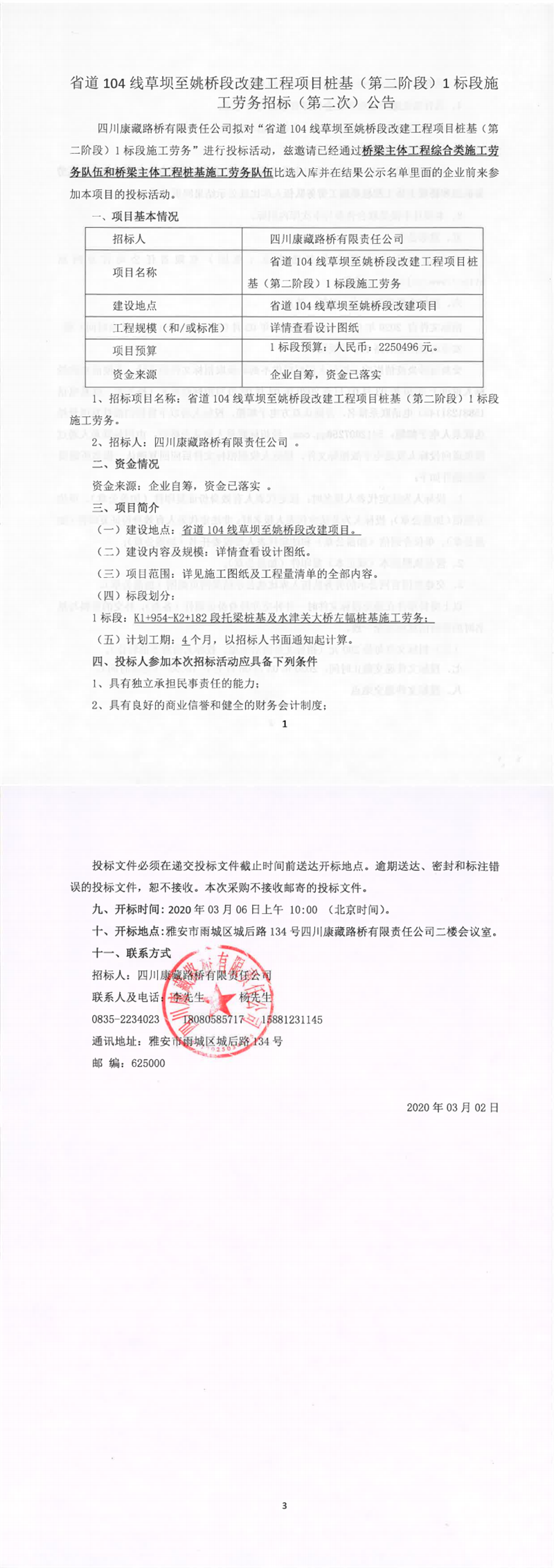 四川康藏路橋有限責(zé)任公司省道104線草壩至姚橋段改建工程項目樁基(第二階段)1標(biāo)段施工勞務(wù)招標(biāo)(第二次)公告