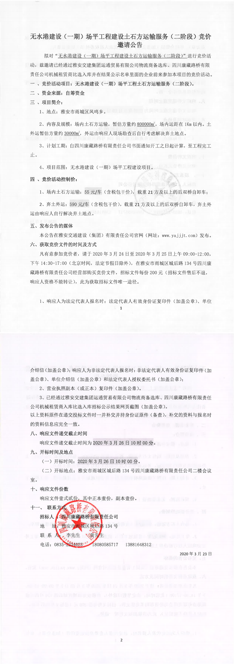 四川康藏路橋有限責(zé)任公司無水港建設(shè)(一期)場平工程建設(shè)土石方運輸服務(wù)(二階段)競價邀請公告