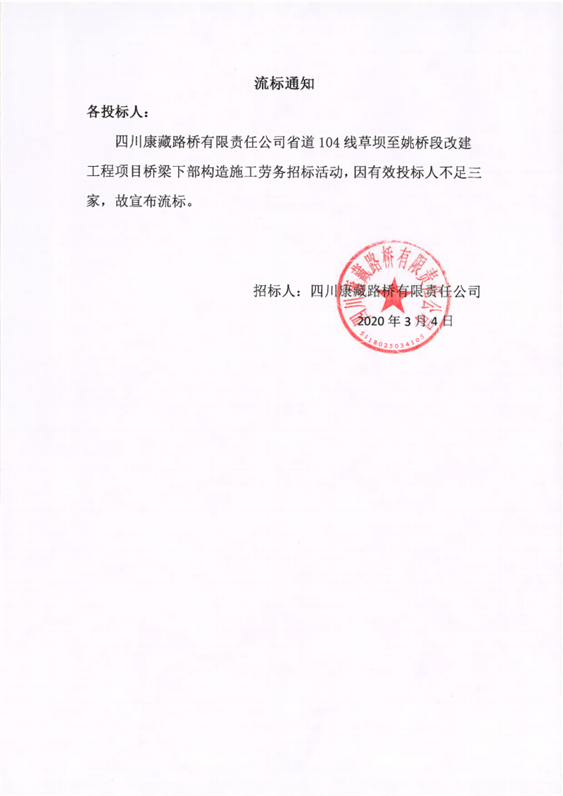 四川康藏路橋有限責(zé)任公司省道104線草壩至姚橋段改建工程項目橋梁下部構(gòu)造施工勞務(wù)流標通知
