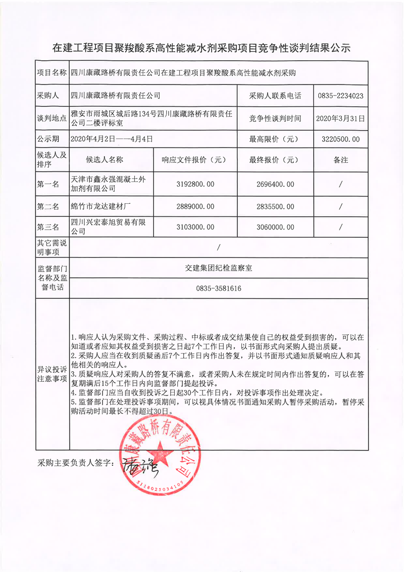 四川康藏路橋有限責(zé)任公司在建工程項(xiàng)目聚羧酸系高性能減水劑采購項(xiàng)目競(jìng)爭(zhēng)性談判結(jié)果公示
