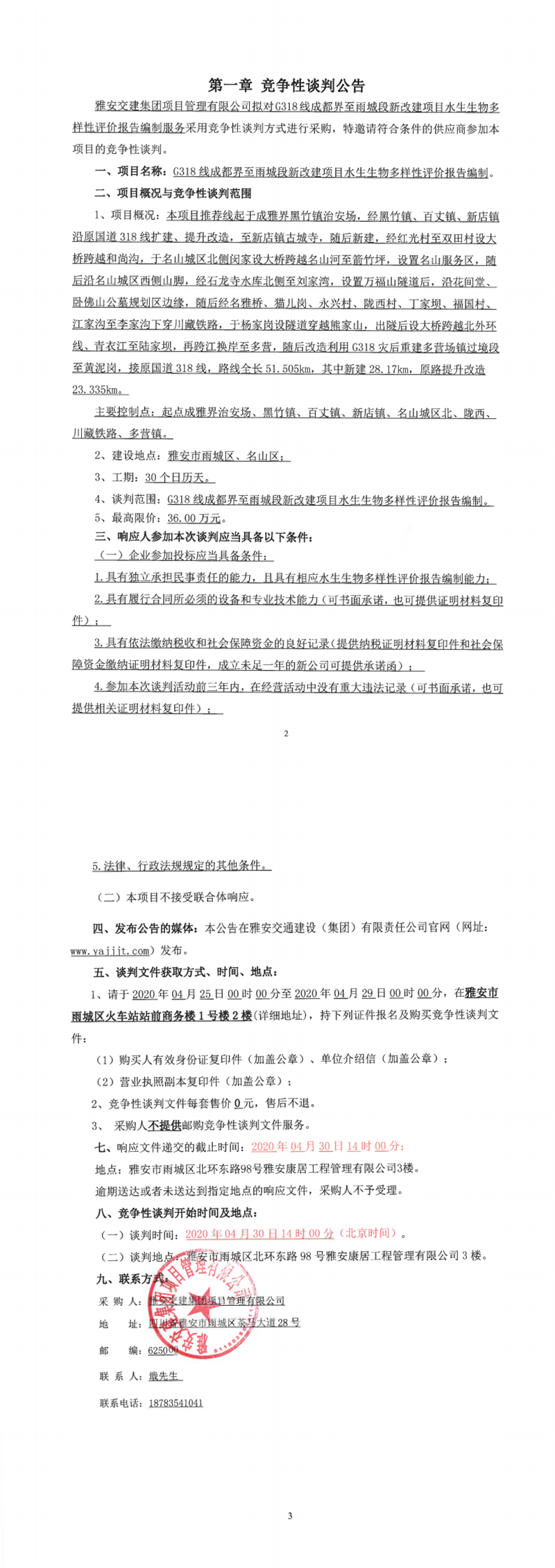 雅安交建集團項目管理有限公司G318線成都界至雨城段新改建項目陸生生物多樣性影響評價編制競爭性談判公告