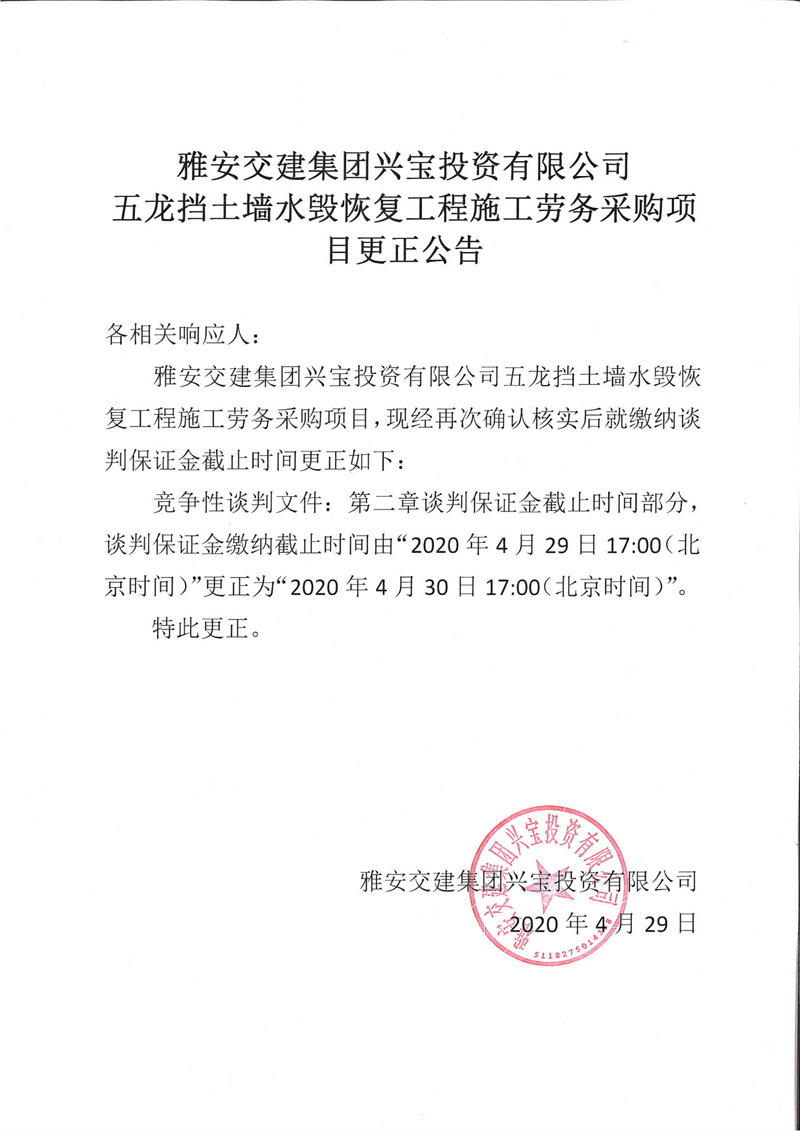 雅安交建集團(tuán)興寶投資有限公司五龍擋土墻水毀恢復(fù)工程施工勞務(wù)采購項(xiàng)目更正公告