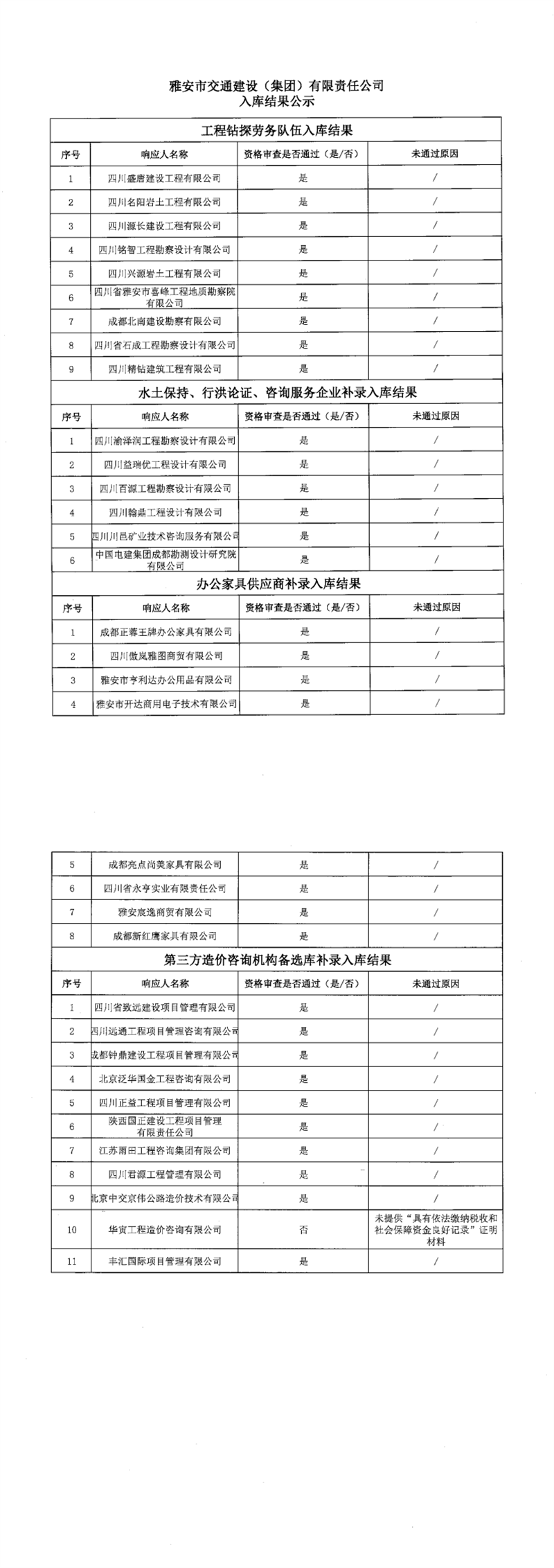 雅安市交通建設(集團)有限責任公司入庫結果公示