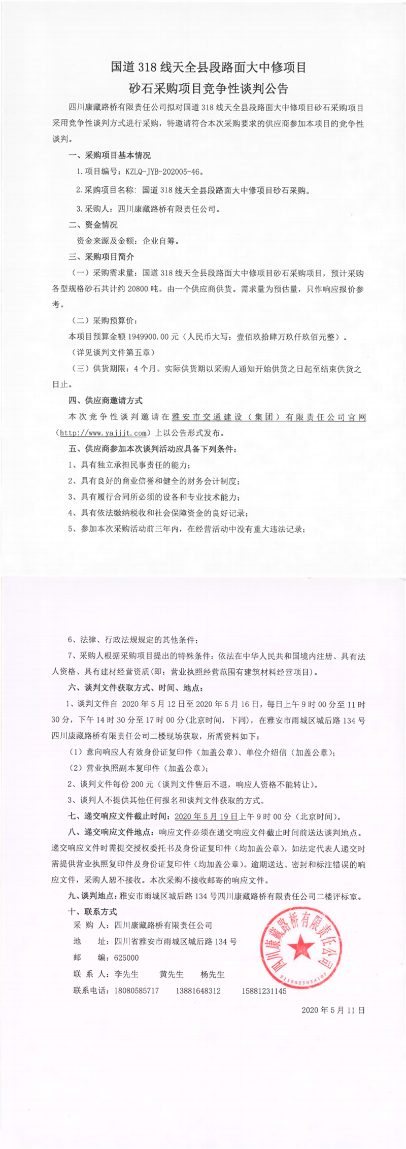 四川康藏路橋有限責(zé)任公司國道318線天全縣段路面大中修項(xiàng)目砂石采購項(xiàng)目競(jìng)爭(zhēng)性談判公告
