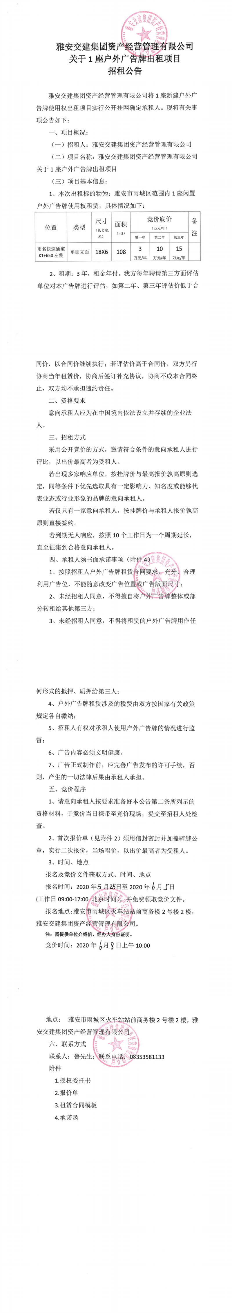 雅安交建集團(tuán)資產(chǎn)經(jīng)營管理有限公司關(guān)于1座戶外廣告牌出租項(xiàng)目招租公告