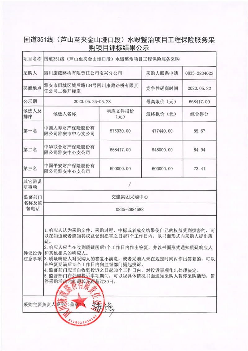 四川康藏路橋有限責(zé)任公司寶興分公司國(guó)道351線(蘆山至夾金山埡口段)水毀整治項(xiàng)目工程保險(xiǎn)服務(wù)采購項(xiàng)目評(píng)標(biāo)結(jié)果公示